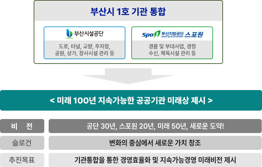부산시설공단이 정부 공공기관 혁신정책에 맞춰 2023. 5월 1일 부산지방공단 스포원과 기관통합을 하였습니다.